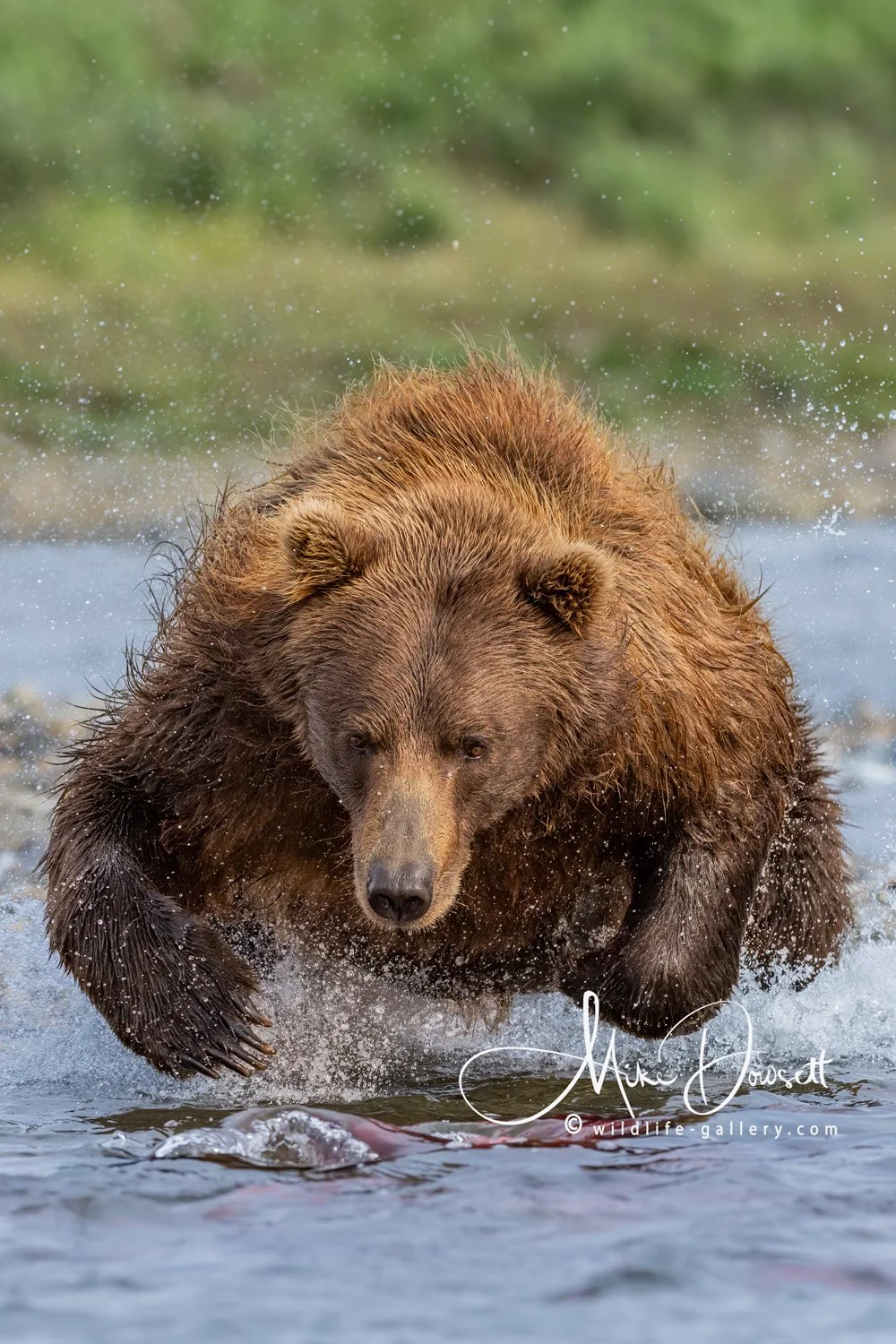 As most wildlife photographers do, I had an image in my mind that I hoped to capture while in Alaska. A massive Grizzly Bear charging at 30mph into a creek and diving into a shoal of sockeye salmon ! Well I got lucky. Very lucky, as I managed to capture several images of charging and diving Bears.