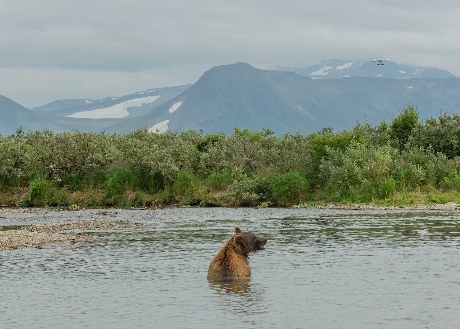 My wife Kimberly captured this image that summarizes our Alaskan adventure perfectly. A huge Grizzly Bear fishing in the shallow creek, light rain and mist and a float-plane in the distance navigating around the snow capped Katmai mountains.