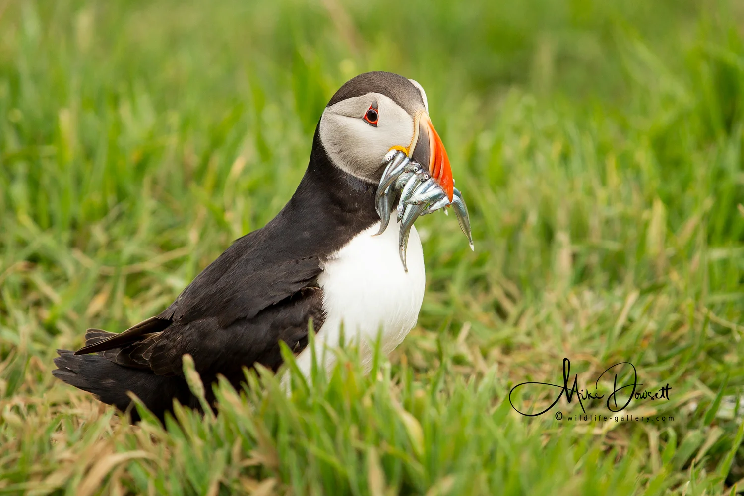 An Atlantic Puffin with a face full of sandeels for the chicks hiding in the cliff face tunnels, 13 or 14 sandeels I believe.